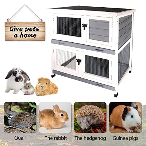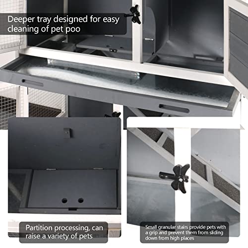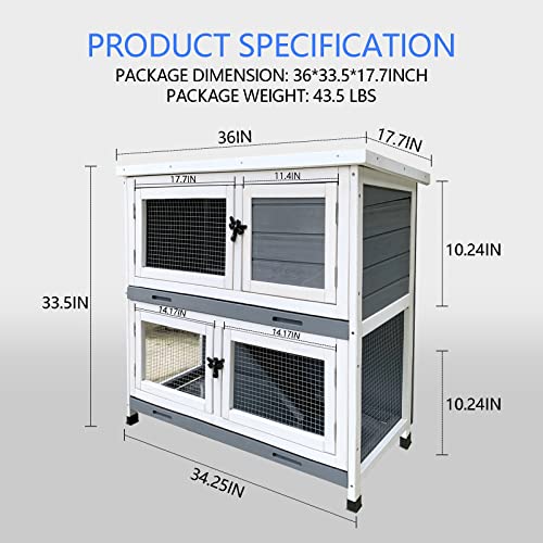 Specification: 2 Story Solid Wood Rabbit/Bunny Hutch with 2 Large Main Rooms, Indoor Outdoor Rabbit House Guinea Pig Cage Pet House for Small Animals with Ventilation Door Removable Tray Waterproof Roof (Grey)