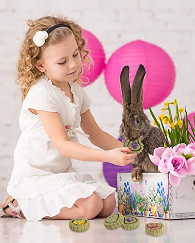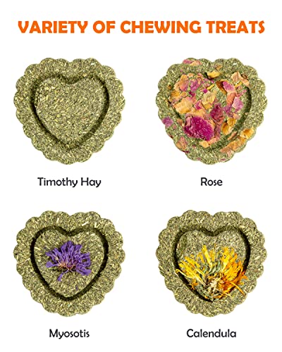 12PCS TIMOTHY TREATS: This set of timothy hay treats includes 4 different flavors: 3 original timothy hay cakes, 3 rose timothy hay cakes, 3 myosotis timothy hay cakes and 3 calendula timothy hay cakes. NATURAL MATERIAL: Timothy hay treats are handmade from 100% natural material, healthy and harmless. Have NO pigment or hormone. Perfect treats and chew toys for small animals like rabbit,bunny,guinea pig,hamster,chinchilla,rat and etc.